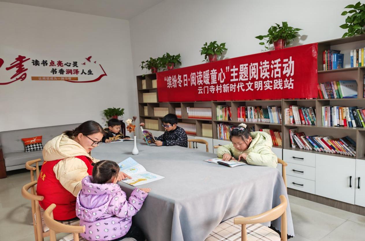 “千门万户曈曈日,总把新桃换旧符。”云门寺村农家书屋内正在举行“缤纷冬日·阅读暖童心”主题阅读活动,孩子们看绘本、读诗词,穿越时空,在书本的世界里畅游古代春节的热闹盛景。“相传,中国古时候有一种叫‘年’的怪兽,头长触角,凶猛异常。”志愿者老师坐在孩子们中间,以生动活泼的语言、绘声绘色地描述,为孩子们讲解春节的起源、习俗和传说。从“年兽”的故事到贴春联、放鞭炮的由来,每一个细节都栩栩如生,让孩子们听得入神,沉浸在春节文化的深厚底蕴之中。阅读会结束后,孩子们纷纷分享自己的心得体会,感叹春节的源远流长,表达对传统文化的喜爱和兴趣。