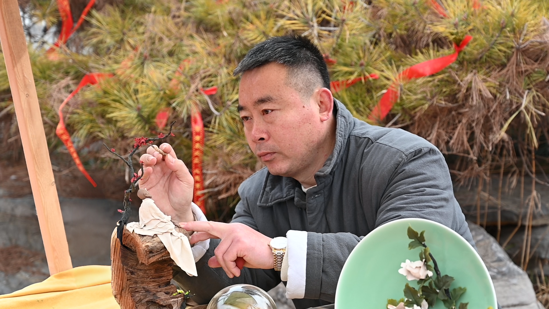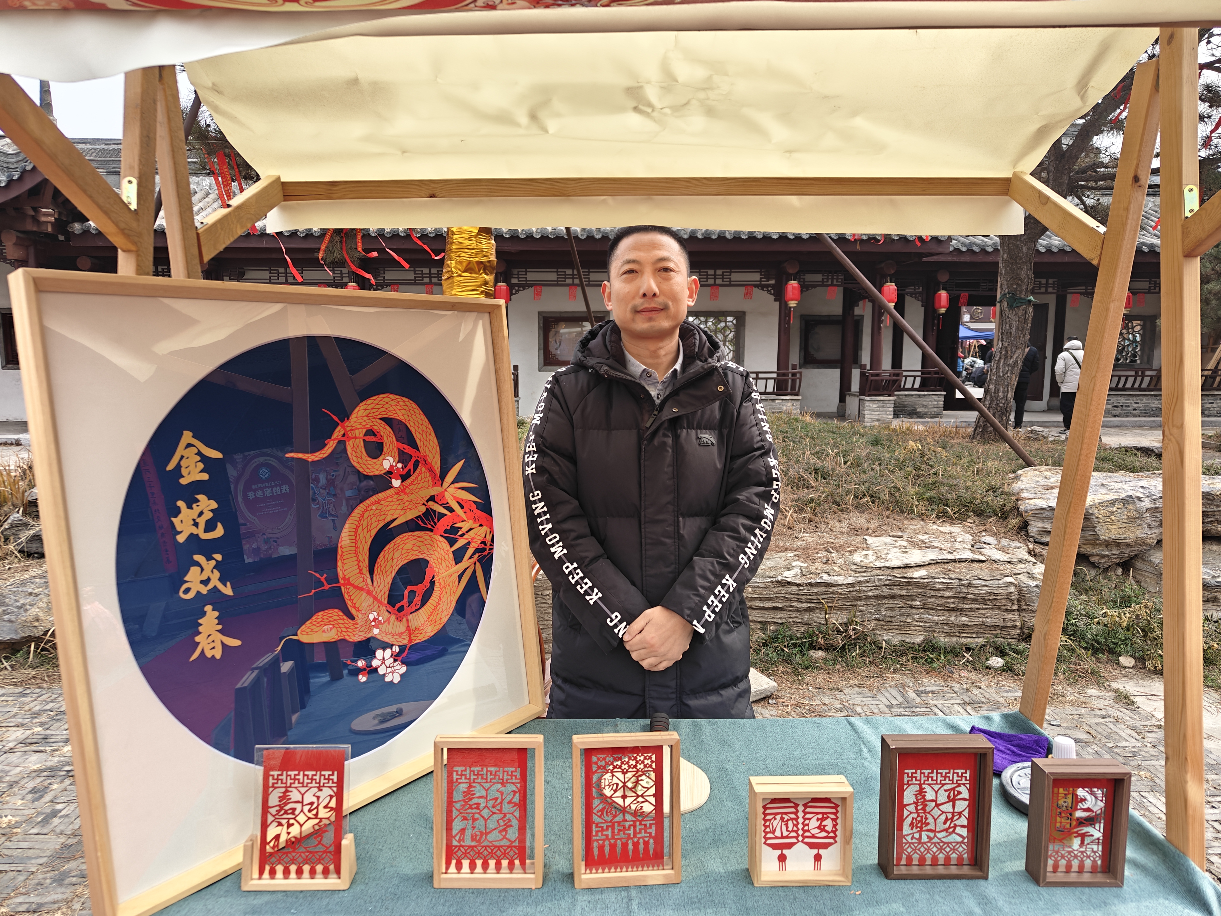 在崇圣书院门口,有两排户外非遗作品展销摊位,摊位上不仅摆满了精美的非遗作品,还有非遗传承人现场展示传统技艺,为活动添彩。“这是特地为乙巳年创作的《金蛇戏春》剪纸画,采用的是套色剪纸工艺,将四种颜色的纸张进行叠加,一次性剪切出多层的图案,让作品更加色彩丰富、层次分明。”剪纸(清江浦挂廊)非遗传承人段恺说,家里从爷爷辈就开始创作剪纸和挂廊作品,他会继续传承和发扬好剪纸技艺,积极参加各类非遗推广和互动活动,吸引更多年轻人关注非遗、传承非遗。