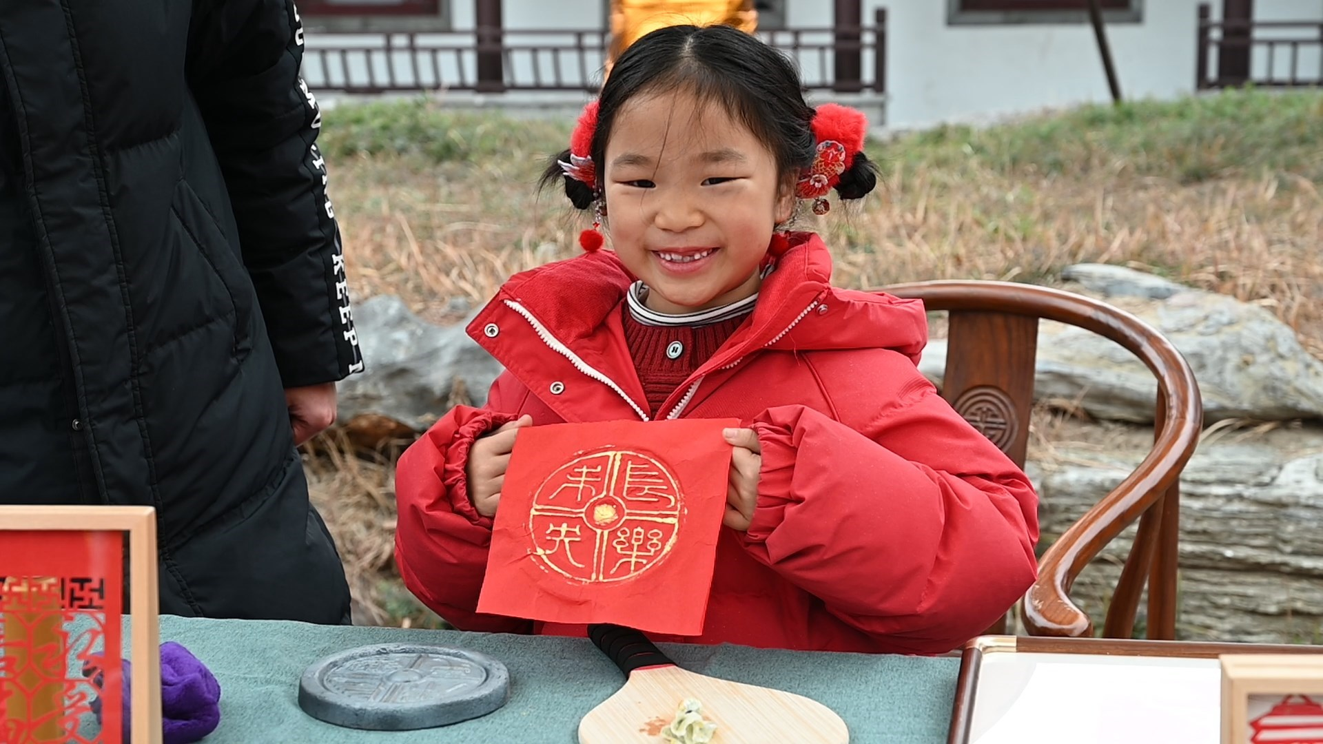 “先把红纸蒙在石刻上,再用湿毛巾轻轻打湿红纸……”活动现场,6岁的蔡一诺在非遗传承人的指导下制作石刻拓片。她小心翼翼地将金色颜料均匀地刷在红纸凸起的部分,经过晾干后将红纸剥离石刻,一张印有“长乐未央”的拓片便制作完成。