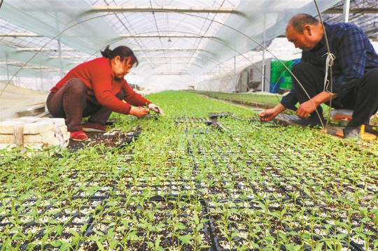 图为农民在蔬菜大棚里管护辣椒苗。(朱吉鹏 摄)