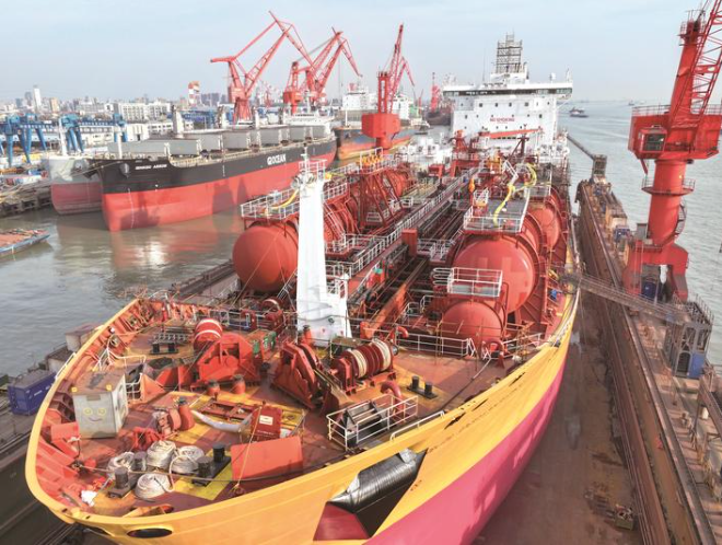 6日在崇川区拍摄的南通中远海运船务码头上的众多修理、改装船舶。南通中远海运船务是全国船舶修造及海工建造行业龙头企业之一,2024年,公司加快向优质高效、数字赋能、绿色生产转型,全年修理改装船舶近200艘,产值连续稳步递增。(许丛军)