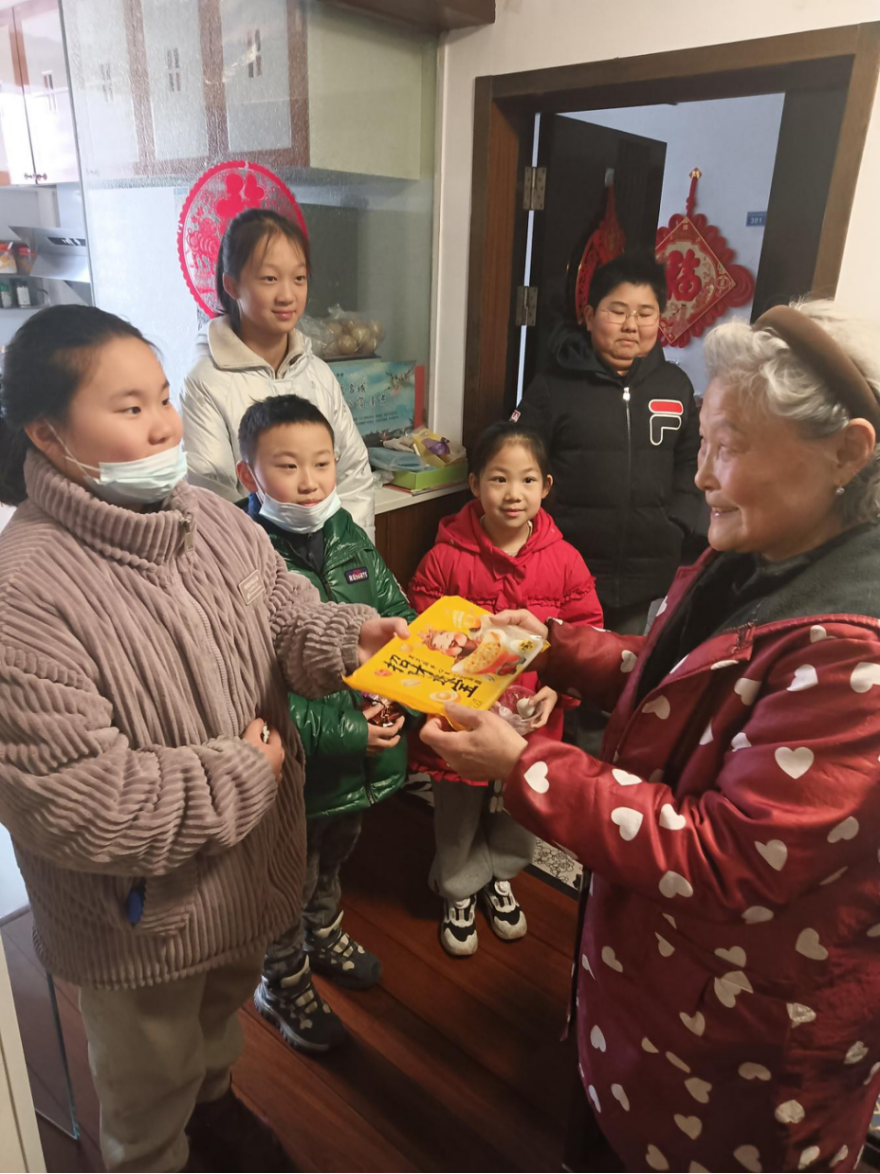 活动最后,社区网格员和小朋友们组成了爱心慰问小队,上门为社区独居老人送元宵。每到一户,孩子们都用稚嫩的童声送上节日祝福。社区书记刘亚红带着精心准备的元宵,前往104 岁老人家中,亲切地拉着老人的手唠家常、嘘寒问暖。