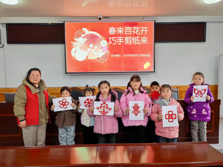 春来百花开,巧手剪纸来。义兴村将非遗剪纸巧妙融入阅读活动,为孩子们带来一场别开生面的传统文化体验。剪纸爱好者张老师生动讲述剪纸的民俗渊源与技艺精髓,她边演示边讲解,从折叠纸张到精准剪裁,一步步将红纸变为艺术,为小朋友们上演了一场指尖的“魔法秀”。大家全神贯注地沉浸在剪纸的乐趣里,或裁或绘,或折或剪,很快,一幅幅形态各异、生动逼真的作品跃然纸上。欢声笑语中,大家共同享受着剪纸带来的乐趣,感受传统文化的独特魅力。