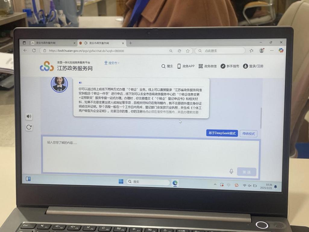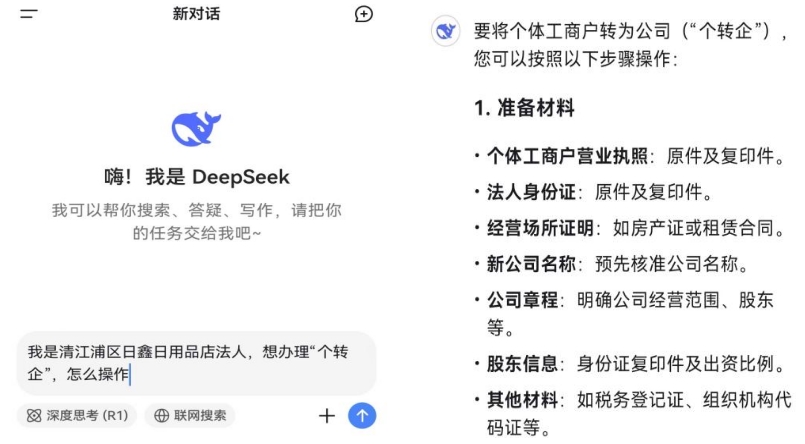 近日,淮安市清江浦区日鑫日用品店法人来到该区数据局,在已经接入了DeepSeek-R1大模型的本地政务模型“AI小安”的帮助下,很快完成了“个转企”登记业务,并顺利领取了新公司的营业执照。这是淮安市首个通过DeepSeek大模型办理的企业登记业务。