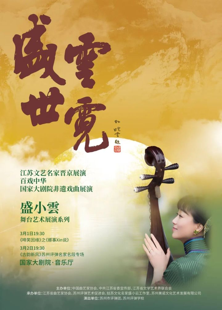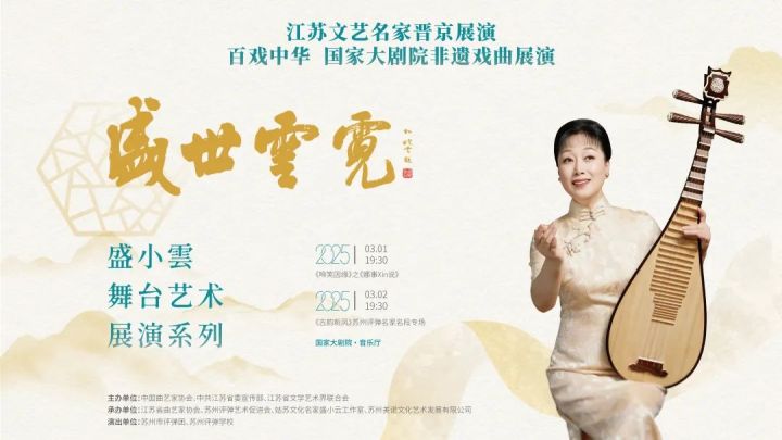 3月1日至2日,由中国曲艺家协会、中共江苏省委宣传部、江苏省文学艺术界联合会主办的“紫金文化奖章”获得者盛小云领衔的江苏文艺名家晋京、百戏中华国家大剧院非遗戏曲——《盛世云霓》盛小云舞台艺术展演系列活动将于国家大剧院音乐厅举行。