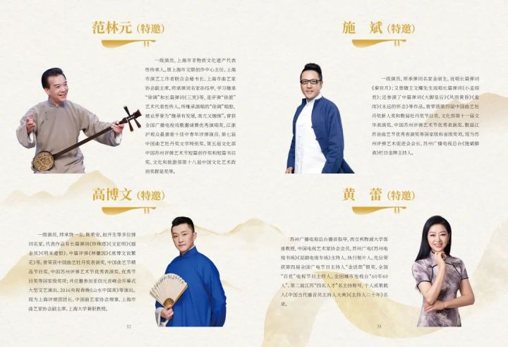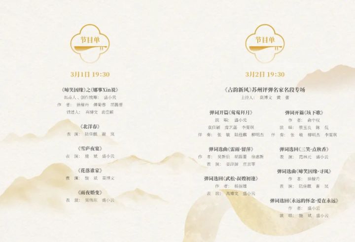 此次展演系列由盛小云领衔,还邀请了高博文、范林元、施斌、吴伟东、陈侃、蔡玉良等苏州评弹界的中青年艺术名家,以及盛小云的学生陆佳麒、谢岚、袁佳颖、娄津源、庞艺菡、李雯琪、庄芸菲等书坛新秀。演出阵容横跨苏沪,名家新秀轮番登场,从节目主持、故事讲述到倾情献演,将为首都观众带来一场视听盛宴。