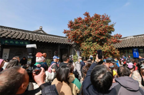 踏入青砖黛瓦的溱潼古镇,一株树龄逾800年的“华夏茶花王”正以满树猩红迎接八方游人。这株宋代遗珍,花瓣层叠如锦,花开时如烈焰灼灼,与斑驳的老墙、雕花的门楣相映成趣。