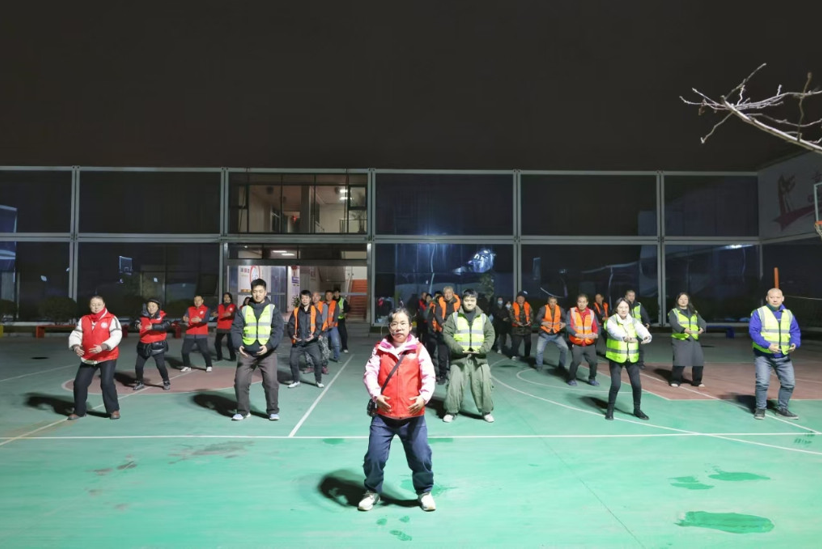 专业八段锦培训老师借助江苏省视界云平台“健康周周练”云端资源,以“大屏演示+动作拆解”双轨教学模式展开指导。当屏幕播放“双手托天理三焦”标准演示时,老师同步动态拆解招式要点:“手腕放松如握棉花,动作要稳,呼吸要匀!”针对工友真实反映调整教学进度。在理论讲解结束后,全体参训人员有序转场至项目部篮球场开展实操训练。培训老师逐一对“双手攀足固肾腰”“攒拳怒目增气力”等招式进行拆解,通过“慢动作演示-集体跟练-个别指导”三轮强化教学,确保动作规范。