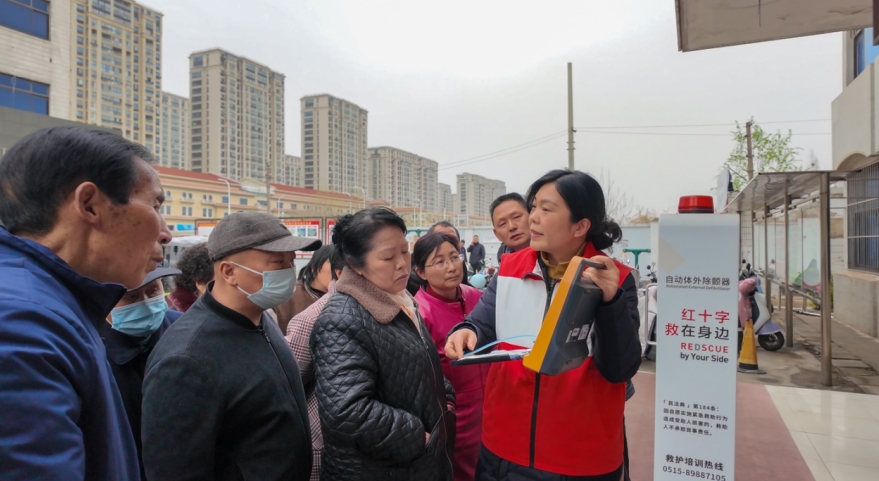 发生火情、接到警报、启动应急……消防演练拉开序幕。随着警报声响起,演练人员迅速进入紧急逃生状态。现场模拟某住宅楼3楼因电器短路引发火灾,社区应急队伍有序组织居民疏散。在志愿者的搀扶和协助下,老年人安全撤离至指定区域。在实际操作环节,大家积极互动,按照“提、拔、握、压”的操作步骤,体验使用灭火器扑灭初期火灾的过程。此外,巾帼志愿者董志梅还向居民演示自动体外除颤器AED的使用,并示范了心肺复苏、外伤包扎等急救方法。