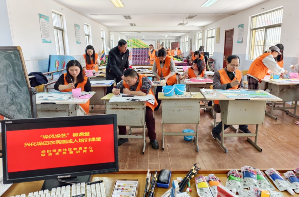 近日,兴化市垛田街道社区教育中心和垛田农民画研究会联合举办了“垛风垛艺微课堂”成人农民画培训班。此次培训旨在通过普及型文化培训,提升广大艺术爱好者的专业素质和艺术修养,丰富群众文化艺术生活,进一步推动乡村文化振兴与艺术繁荣。