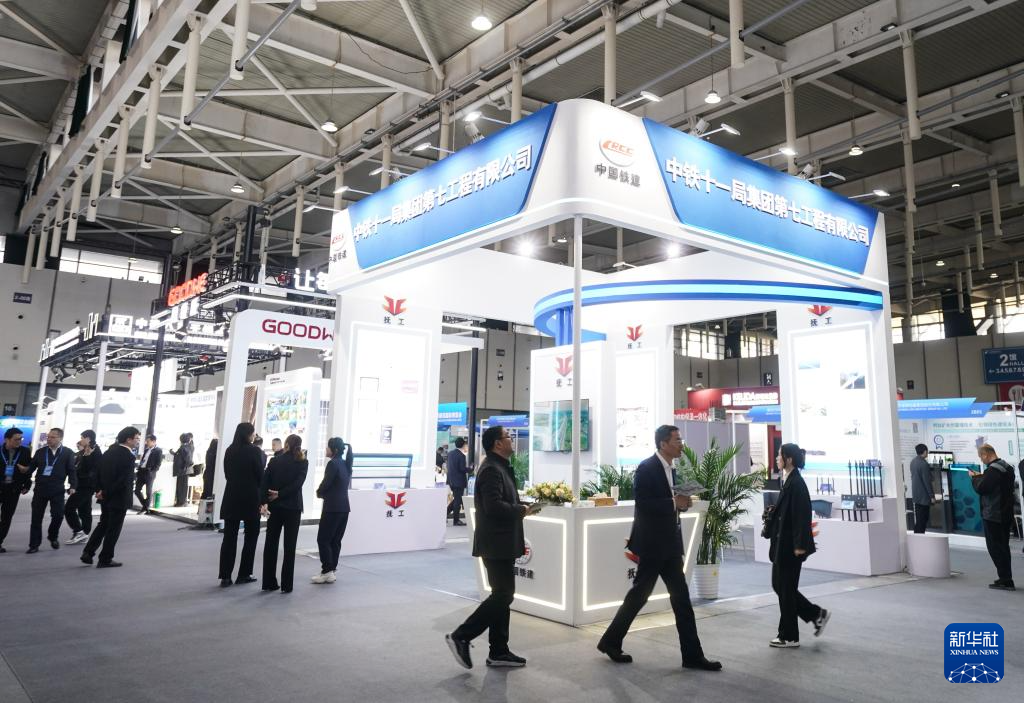4月1日,在2025江苏绿色低碳建筑国际博览会上,参展的中铁十一局第七工程有限公司工作人员(右)向参观者介绍建筑新材料。