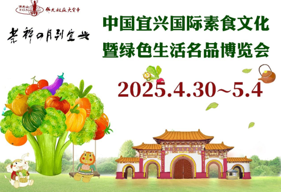 2025第十届海峡两岸(宜兴)素食文化暨绿色生活名品博览会将于4月30日至5月4日在无锡宜兴举办。本次素博会秉持“素食、绿色、有机、健康、环保”五大理念,由星云文化教育公益基金会主办,宜兴大觉寺承办。