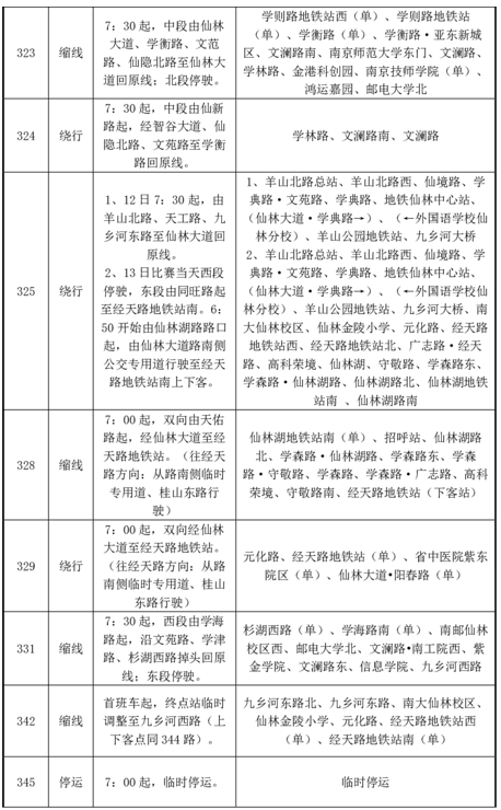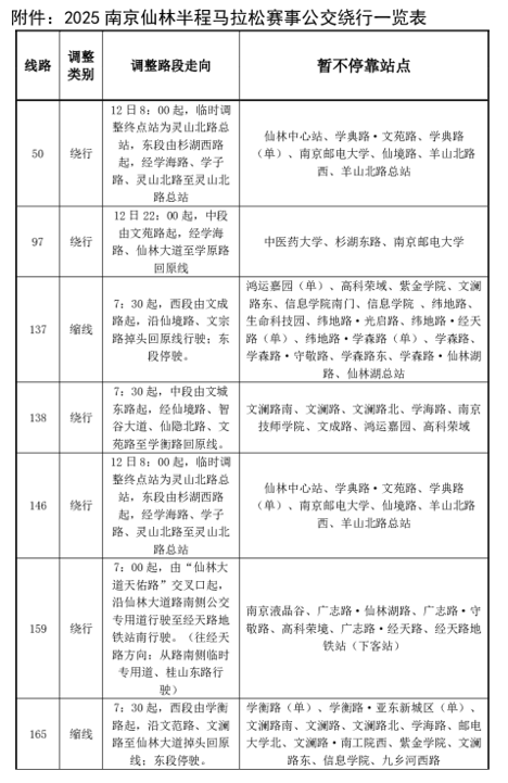 2025南京仙林半程马拉松赛定于4月13日上午7:30在羊山公园举行。根据公安交管部门交通组织方案,赛事期间栖霞区多条道路分时、分段实施临时交通管控,届时公交50路、97路等共28条线路采取临时绕行、停运等调度措施,待道路恢复车辆通行后线路立即恢复。敬请广大市民提前做好出行安排。(周素娟)