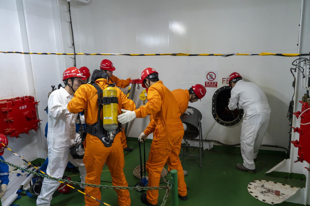本次演练模拟船舶溢油和进入封闭空间救助两个场景,涉及信息通报与响应、溢油围控清理、救援装备穿戴、医疗应急救治等多个科目。演练开始后,船上工作人员和施工项目部立即启动应急预案,并向连云港海上搜救中心报告。接报后,搜救中心立即组织救援力量前往现场处置,在海巡艇、施工船舶和附近船舶的共同努力下,溢油得到有效控制和清理,进入封闭空间受伤人员被成功救助,险情解除。
