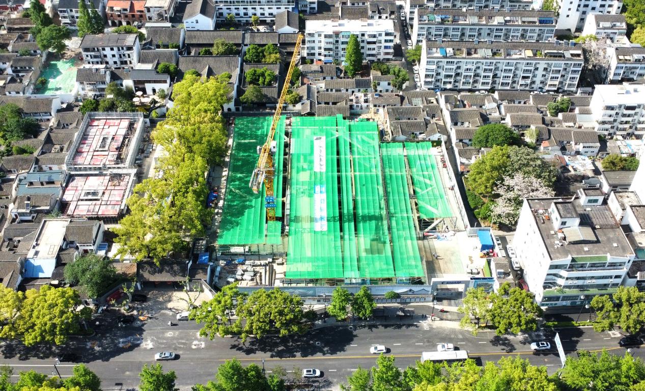修旧如旧,传承历史文脉;匠心坚守,加速项目建设。在位于苏州市姑苏区道前街170号的江苏按察使署及周边地块项目施工现场,在绿色的天幕遮挡下,近百名施工人员正抓紧施工作业。该天幕的投入使用,使得传统露天作业变为“室内作业”,有效减少扬尘外溢量,从源头上解决了扬尘、噪音、光污染等一系列问题。目前,项目东区地板已完成浇筑,西区一层主体结构施工进展顺利,墙柱梁板施工正稳步推进。