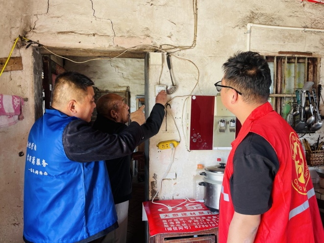 “顾爹爹,我们来给家里做个‘安全体检’!”志愿者刘刚、网格员顾磊、安全员顾迅豪重点关注独居老人家庭,逐户上门排查安全隐患。在顾老爹家中,社区工作者们仔细检查液化气罐阀门密封性,查看减压阀是否存在老化问题,同时对用电线路进行细致检测。发现线路存在老化迹象后,顾磊耐心叮嘱:“顾爹爹,这些线路使用年限久了,容易引发短路,您一定要尽快联系专业人员更换,平时用电也要多注意安全。”