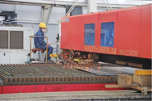 图为近日,全自动大型激光切割机正根据设计图纸,裁剪VOCs处理设备相关组件。