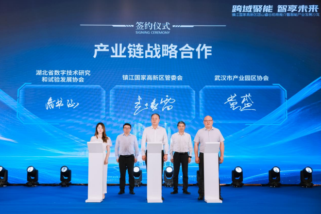 活动现场,湖北省数字技术研究和试验发展协会、武汉市产业园区协会分别与镇江高新区管委会签署产业链战略合作协议,三方将围绕技术转化、企业孵化、人才互通等领域展开全方位协作,为两地智能产业发展注入新动能。镇江纽莱企业管理有限公司、武汉市数苍科技服务有限公司、金拓鼠文化(武汉)有限公司、武汉星雪数据科技有限公司等企业与镇江高新发展集团签约落户团山睿谷。