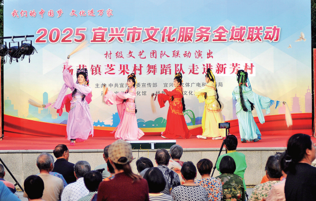 近日傍晚,作为2025宜兴市文化服务全域联动子活动之一,杨巷镇芝果村舞蹈队走进该镇新芳村,开展村级文化联动文明实践活动。现场,10个节目精彩上演,为上千名观众送上夏夜文化大餐,同时促进了两村文化交流。图为活动现场。(龚建平摄)