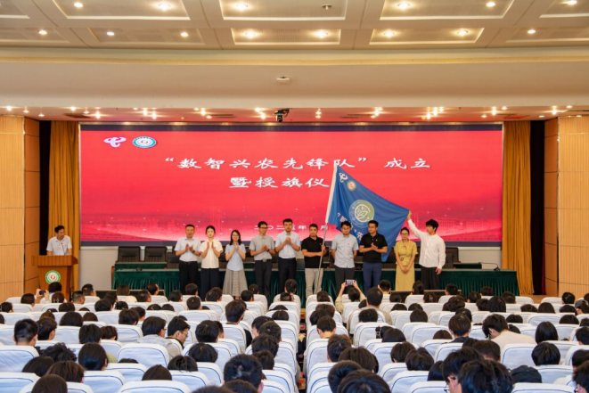 仪式现场,由校企双方党员骨干、技术专家及优秀学生组建的“数智兴农先锋队”正式成立。中国电信泰州分公司党委委员、副总经理蒋锋为先锋队授旗。队徽融合绿色农业符号与蓝色科技元素,彰显“科技赋能农业”的神圣使命。该团队将聚焦智慧农业研发、技术推广与志愿服务,推动校企合作成果落地转化。