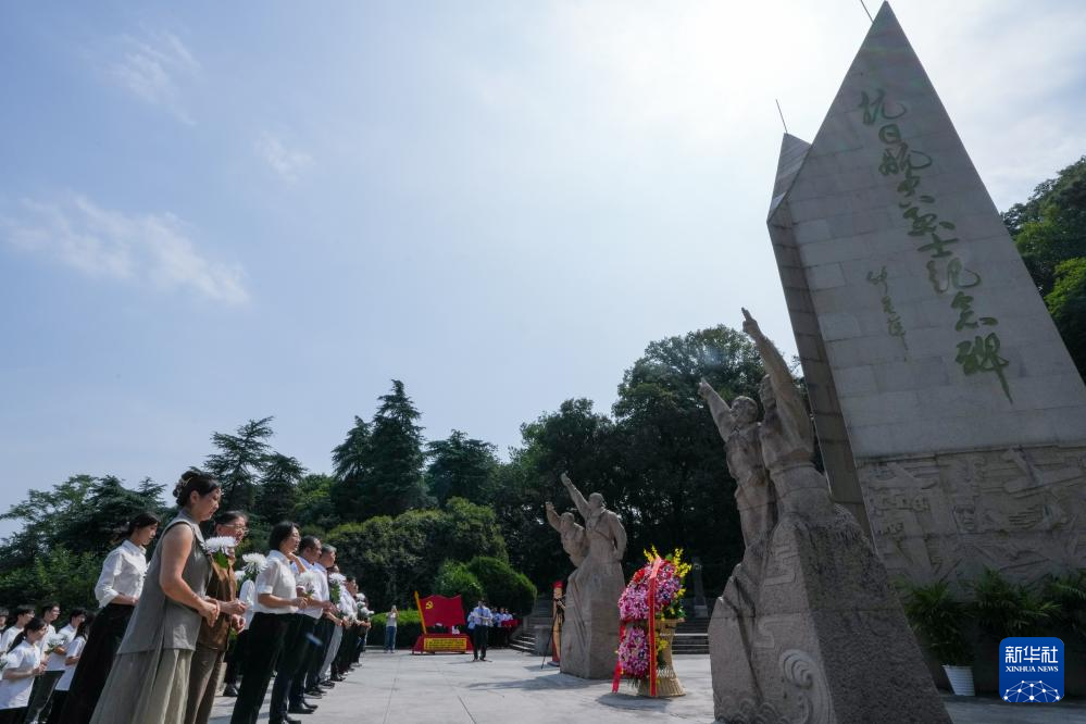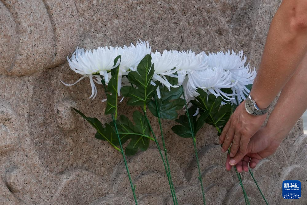 7月7日,观众在南京抗日航空烈士纪念馆纪念碑前献花,缅怀英烈。