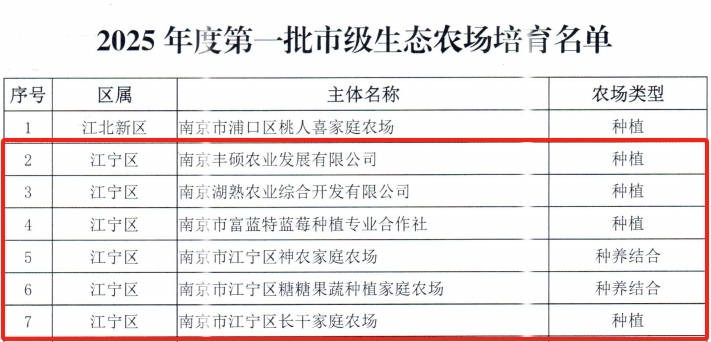 近日,南京市公布2025年度第一批市级生态农场培育名单,江宁区南京丰硕农业发展有限公司、南京湖熟农业综合开发有限公司等6家农业主体成功入选市级生态农场,分布在汤山、湖熟、江宁、谷里、横溪街道,涵盖粮食种植、果蔬种植、种养结合等类型,彰显江宁深入践行生态优先、绿色发展的现代农业理念,坚持走资源节约、环境友好、废弃物循环利用、农产品质量安全可靠之路,加大生态农业技术推广力度,带动更多的生产经营主体走生态农业的发展道路。