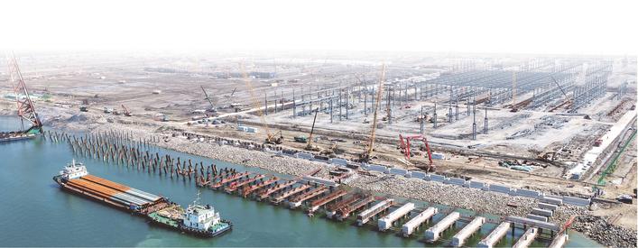 吕四港东港池,总投资90亿元的惠生海工装备制造基地,施工现场塔吊林立、机械轰鸣,目前厂房钢结构安装、码头桩基工程和超大船坞工程都在有序推进中。总投资3.5亿美元的省重大项目燕达(江苏)清洁能源装备制造项目也在加速建设。巨型钢结构骨架如钢铁森林般节节攀升,陆域工程已完成50%。工地上焊花飞溅、机器轰鸣,盛夏的热浪与建设的热情交织成奋进交响乐。