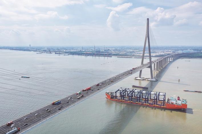 8日,“振华34”轮搭载着万海高雄6台自动化轨道吊缓缓驶离振华南通分公司码头,通过苏通大桥入海发运。该项目是万海建设高雄港第五货柜中心25台核心设备的第三批,目前已经完成发运17台。(许丛军)