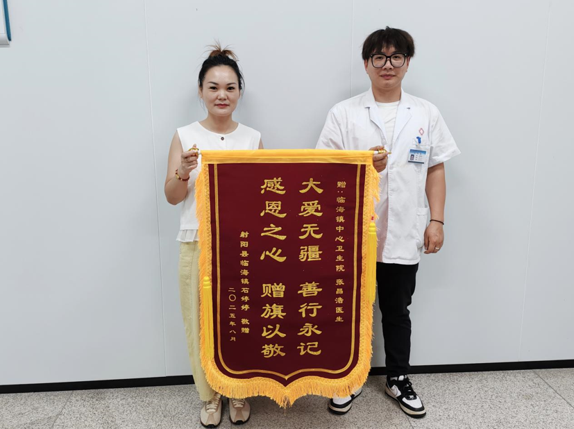 8月6日上午,射阳县临海中心卫生院里,25岁的护士张昌浩接过一面沉甸甸的锦旗。“大爱无疆善行永记 感恩之心赠旗以敬”的字样背后,是被救青少年小吴全家的深切谢意。面对家属的哽咽道谢,这个2000年出生的年轻小伙腼腆一笑:“这是应该做的,换谁都会上。”