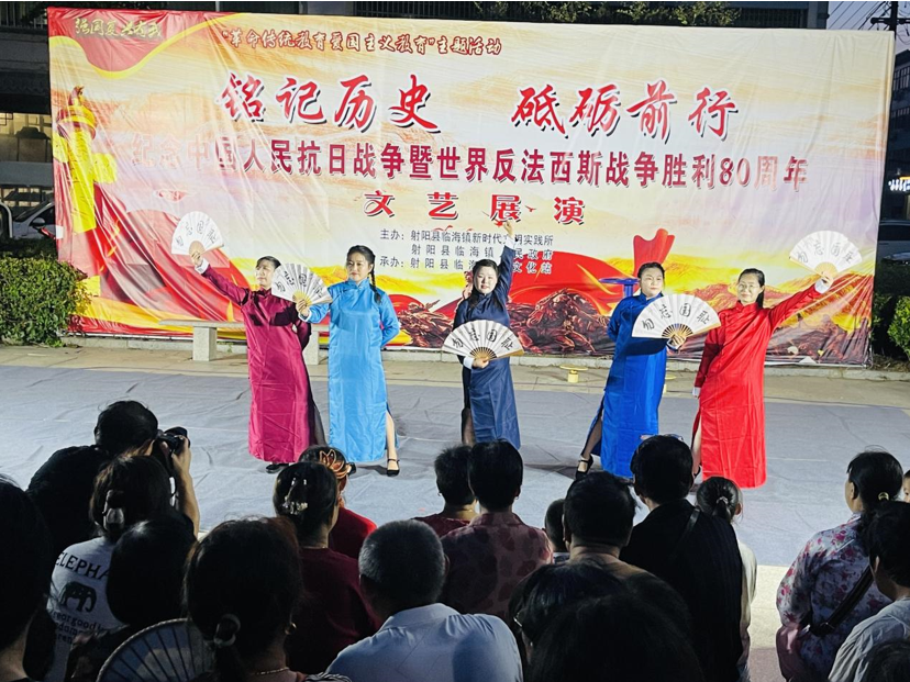 “各位乡亲,晚上好,文艺演出即将开始……”舞台上传来主持人清亮的声音。8月15日19时,射阳县临海镇新时代文明实践所文化广场气氛热烈。由临海镇新时代文明实践所、临海镇人民政府主办,临海综合文化站承办的“强国复兴有我——革命传统教育爱国主义教育”文艺展演举行,传承红色基因,弘扬爱国精神。