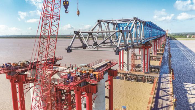 据悉,崇启公铁长江大桥非通航孔桥共有11个桥墩,顶推长度为1205.4米。钢梁在工厂施工,通过水上运输船运到大桥南岸预拼场进行吊装组拼,再分13个轮次(其中9个轮次为112米)向主通航孔方向顶推。崇启公铁长江大桥非通钢梁顶推还剩最后两轮,计划在10月底与主通航孔桥在主桥1号墩与主通航孔3号墩钢梁成功对接,其顶推长度与重量将创国内桥梁建设又一个新纪录。