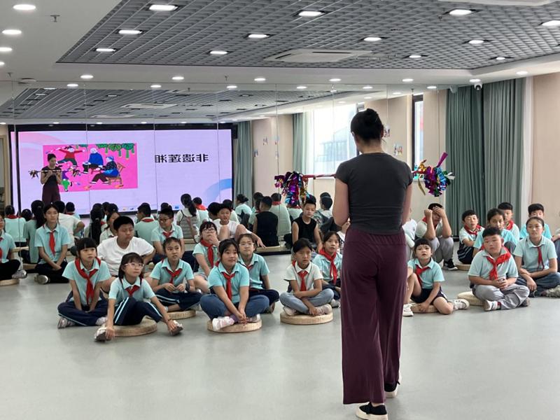 非遗体验环节迎来了两项特色活动。非遗莲湘传承人现场展示了莲湘舞,明快的节奏、灵动的动作让少先队员们眼前一亮。传承人还手把手教学,少先队员们手持莲湘棍,跟着节奏练习基本动作,在欢声笑语中感受传统舞蹈的活力。溱湖纸板画体验同样深受欢迎,在老师的指导下,少先队员们拿起画笔,在纸板上描绘出溱湖秀丽风光和民族元素。