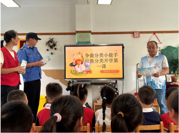 “小朋友们,喝完的牛奶盒应该扔进哪个颜色的垃圾桶呀?”9月1日开学首日,南京六合区龙袍街道垃分办联合城管中队、“凡星”团队志愿者、网格巡查员、街道公众委员及城市治理志愿者走进东沟幼儿园,为孩子们带来一堂生动的垃圾分类“开学第一课”,用趣味互动种下环保小种子。