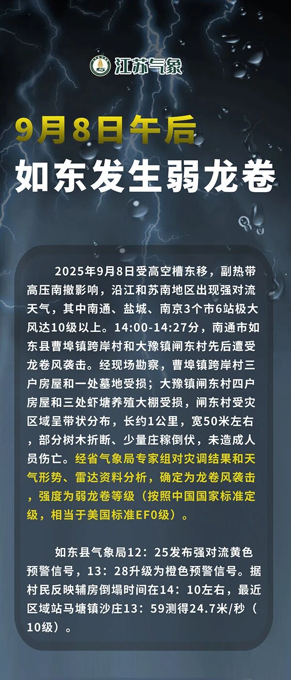 据江苏气象消息,9月8日,南通市如东县曹埠镇跨岸村和大豫镇闸东村先后遭受龙卷风袭击。经省气象局专家组对灾调结果和天气形势、雷达资料分析,确定为龙卷风袭击,强度为弱龙卷等级(按照中国国家标准定级,相当于美国标准EF0级)。