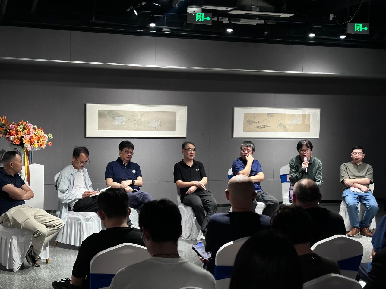 当天下午,展览现场同步举办艺术对谈分享会。中国艺术研究院教授、博士生导师江宏伟,江苏省国画院画家、一级美术师沈勤,江苏省美协副主席刘伟冬,南京艺术学院教授、博士生导师李安源,《澎湃新闻》艺术主编、上海书画院画师顾邨言,《雨花》杂志主编育邦,雨花美术馆执行馆长李文钢等多位嘉宾展开对谈。嘉宾们从创作实践与理论思考等多维角度,探讨了江宏伟艺术中“洗染法”带来的视觉革新、灰色调的诗性表达,以及如何在承续传统的基础上实现当代意涵的转化。