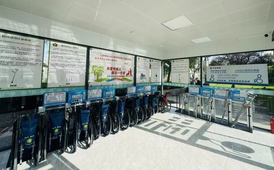 射阳县图书馆和射阳县中医院两个站点升级重点聚焦环境优化、产品丰富和流程智能化三大方向。室内进行重新规划,增设无障碍通道与休息区;辅具品类进一步丰富,覆盖出行、康复等全场景;借还环节全面接入支付宝、微信扫码,实现押金秒扣秒退,后台还可以实时盘点库存,提升了服务效率。与此同时,新建了一个30平方米的室外共享小屋,里面配备的辅具产品涵盖多种类型,从常见的轮椅、助行器,到拐杖、手杖等一应俱全。室外共享小屋的建成后,24小时不间断提供自助租赁服务,满足射阳县残疾人、老年人、伤病人等特需人群多层次、多样化的辅助器具服务需求。
