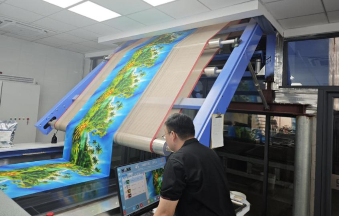 走进沙印纺织有限公司新投入的智能车间内,两台数码印花机正高效运转,一卷卷印染好的布料被精准地输送到设备上,经过高温定型后,变得平整挺括,鲜艳的色彩在灯光下格外夺目。工程师们也紧盯电脑屏幕,实时调控产品参数,确保印花质量精准稳定。