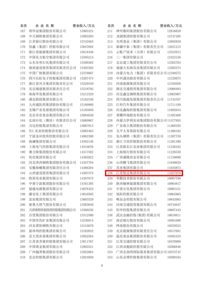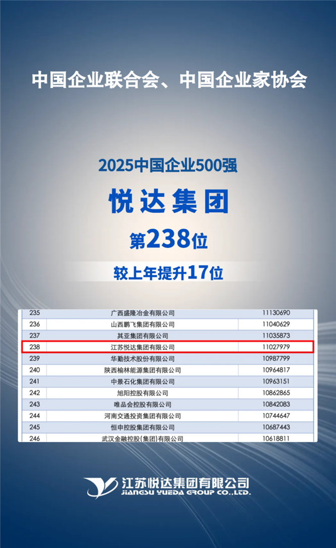 9月15日,中国企业联合会、中国企业家协会发布“2025中国企业500强”榜单,江苏悦达集团有限公司位列中国企业500强第238位,较上年提升17位。