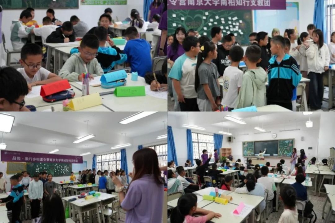 秦书南韵队开设地理诗歌课和环保课程,将爱国教育与生态理念融入互动游戏;南雍商行队推出沙瓶制作和植物拼贴课,引导孩子们探索自然与艺术的无限可能;宁光洛水队创新生命教育课程,开展“生命之始”与“生命之终”双主题教学;南耕商山队以商洛非遗为重点,带领孩子体验家乡文化。南风入云队通过破冰游戏建立情感连接,以“心愿卡”珍藏夏日约定……
