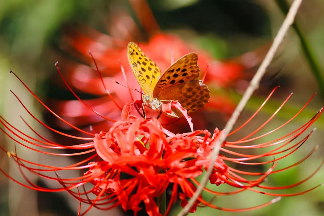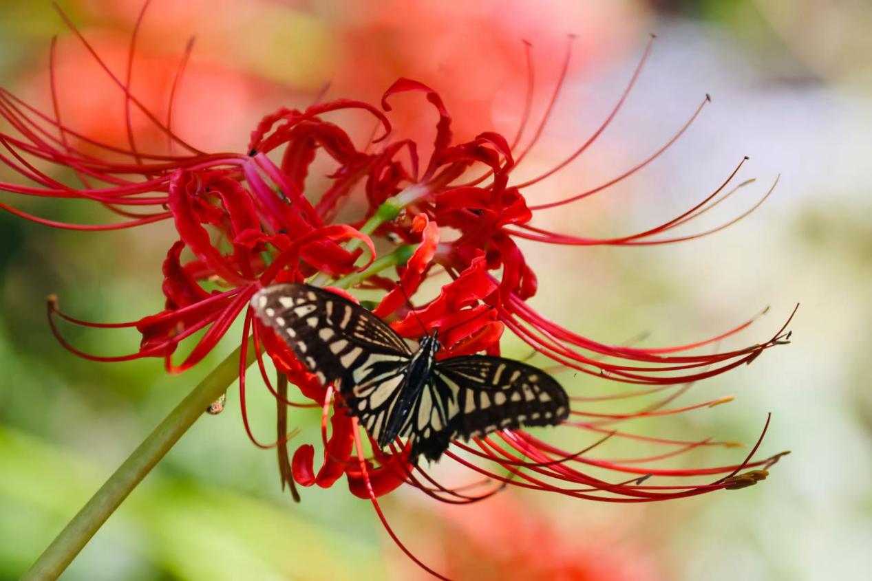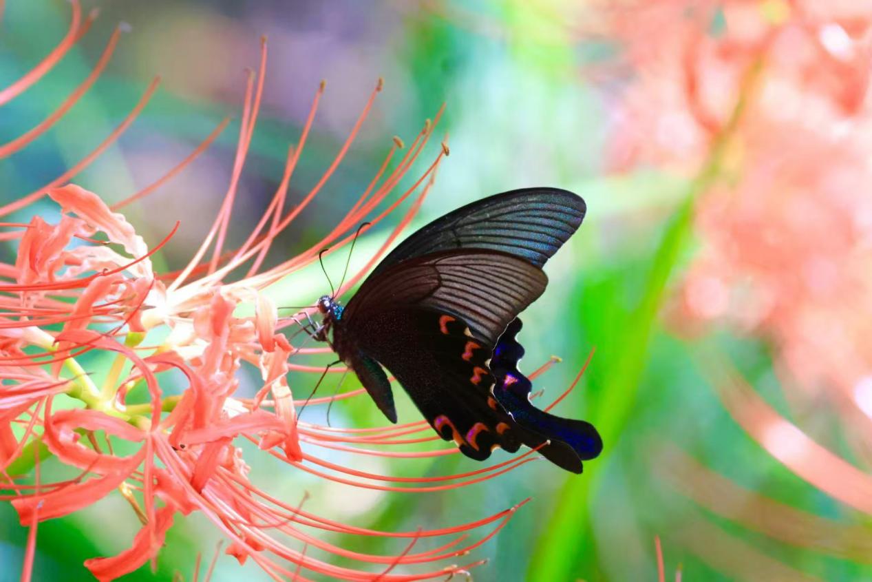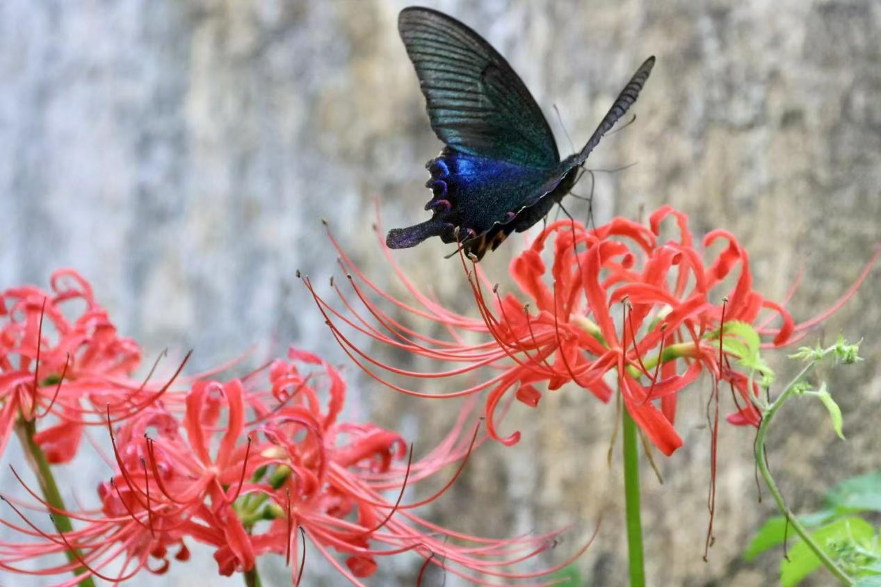 火红的彼岸花引着“蝶中贵族”蓝凤蝶,以及云豹蛱蝶、青豹蛱蝶、柑橘凤蝶、美姝凤蝶等翩翩而至。一只只蝴蝶轻盈地穿梭于花丛间,时而优雅地停驻于花瓣之上,仿佛在倾听彼岸花的低语;时而翩翩起舞,与花儿共谱生命的华美乐章,绘就一幅令人心醉神迷、流连忘返的绝美画卷。(秦继真 周翀)