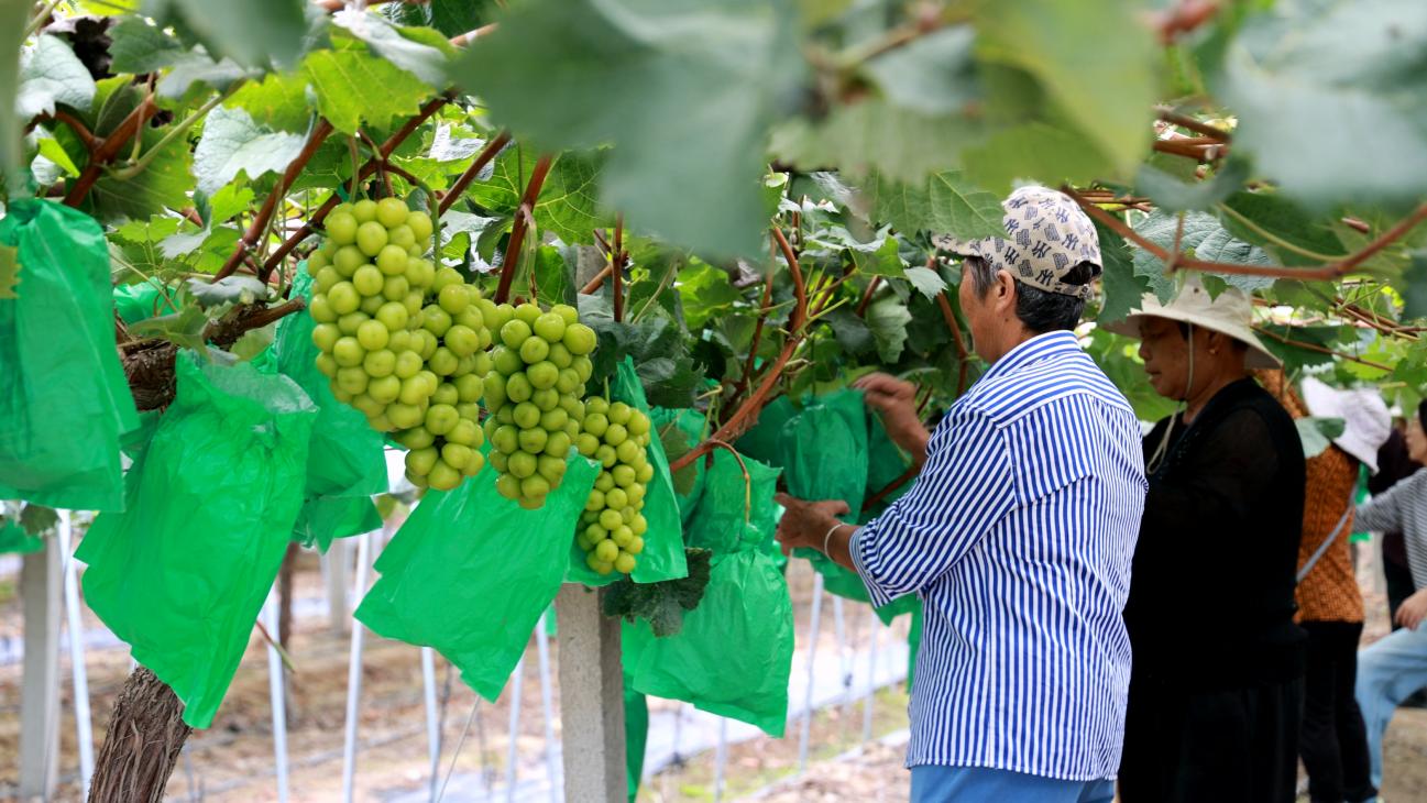 走进葡萄园,翠绿的藤蔓间,纺锤形的“阳光玫瑰”果串排列整齐,果粒紧密饱满,剥开薄如蝉翼的果皮,晶莹的果肉散发着淡淡清香。