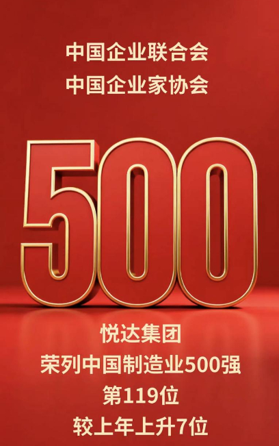 9月20日,在合肥举办的2025世界制造业大会上,中国企业联合会、中国企业家协会发布了2025中国制造业企业500强榜单。悦达集团位列第119位,较上年上升7位。