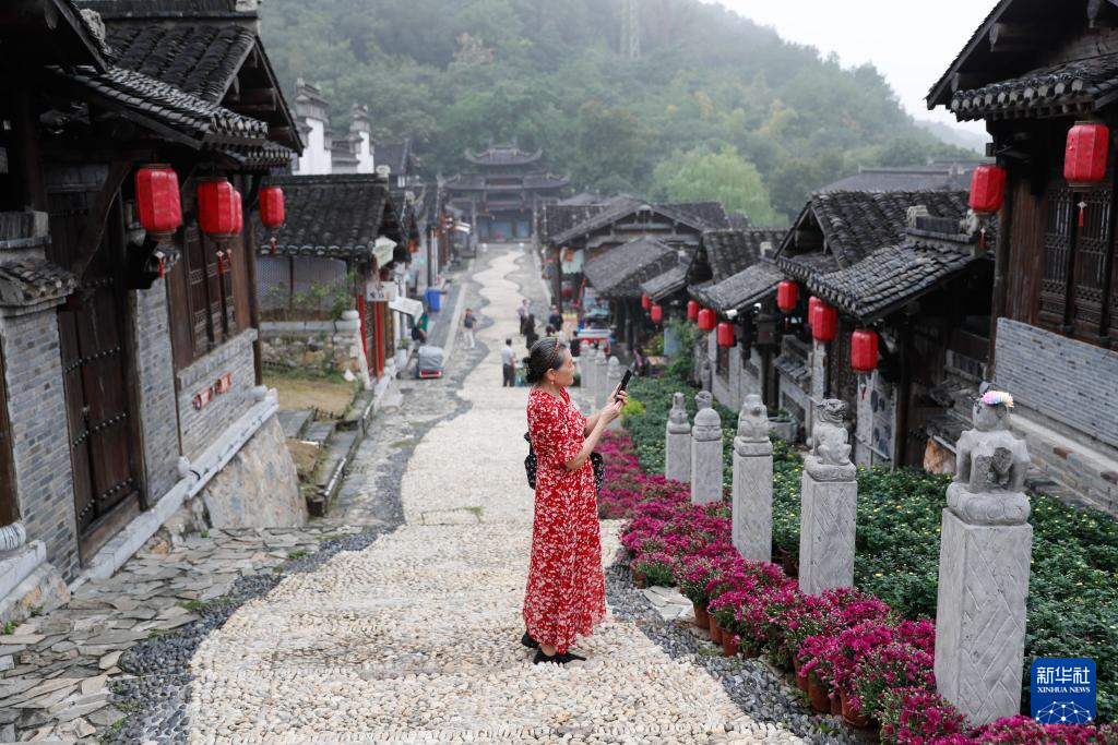 9月27日,游人在宝华山国家森林公园内的千华古村游览拍照。