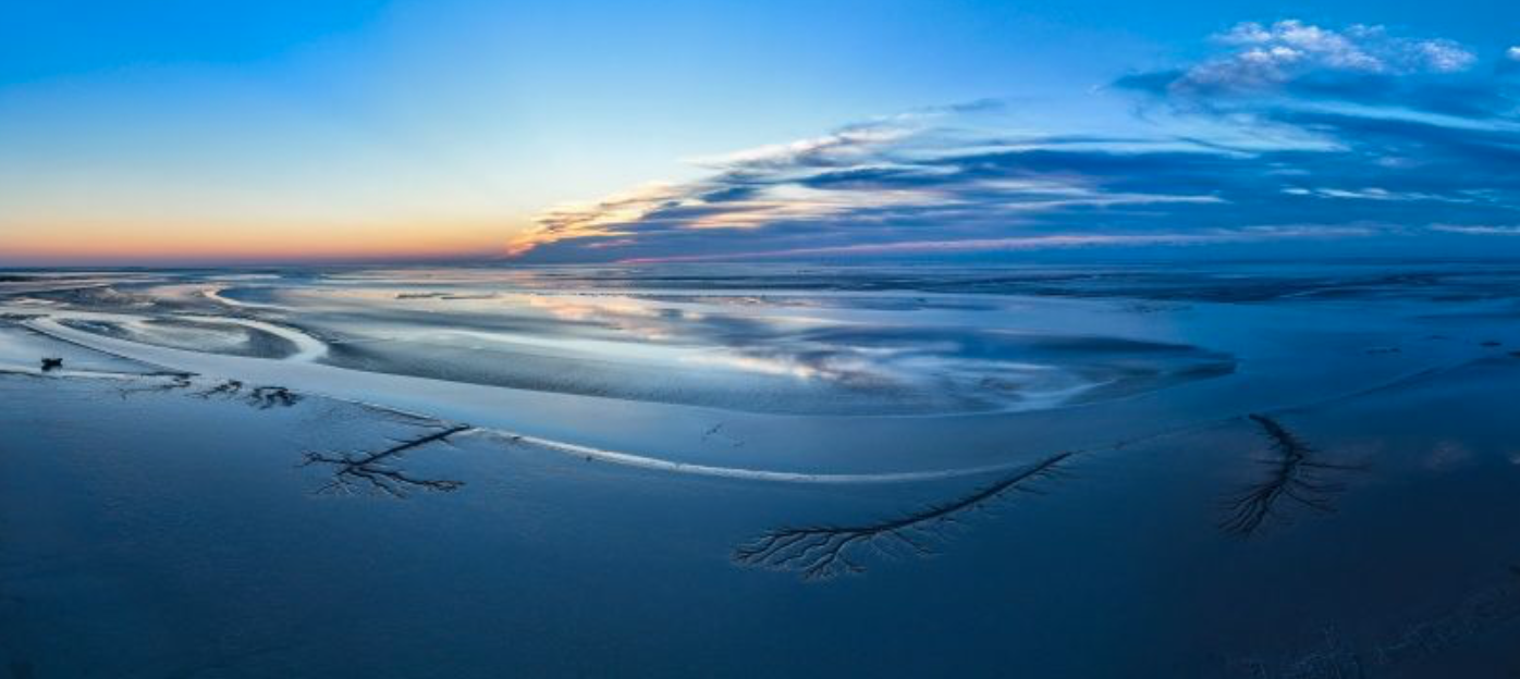 海潮涨落间,潮汐往复冲刷雕刻出无数水道,像数不清的参天巨树在滩面形成“潮汐森林”。蜿蜒的潮沟如巨树枝桠,成为海陆间物质、营养和能量交换的通道,滋养无数生命。