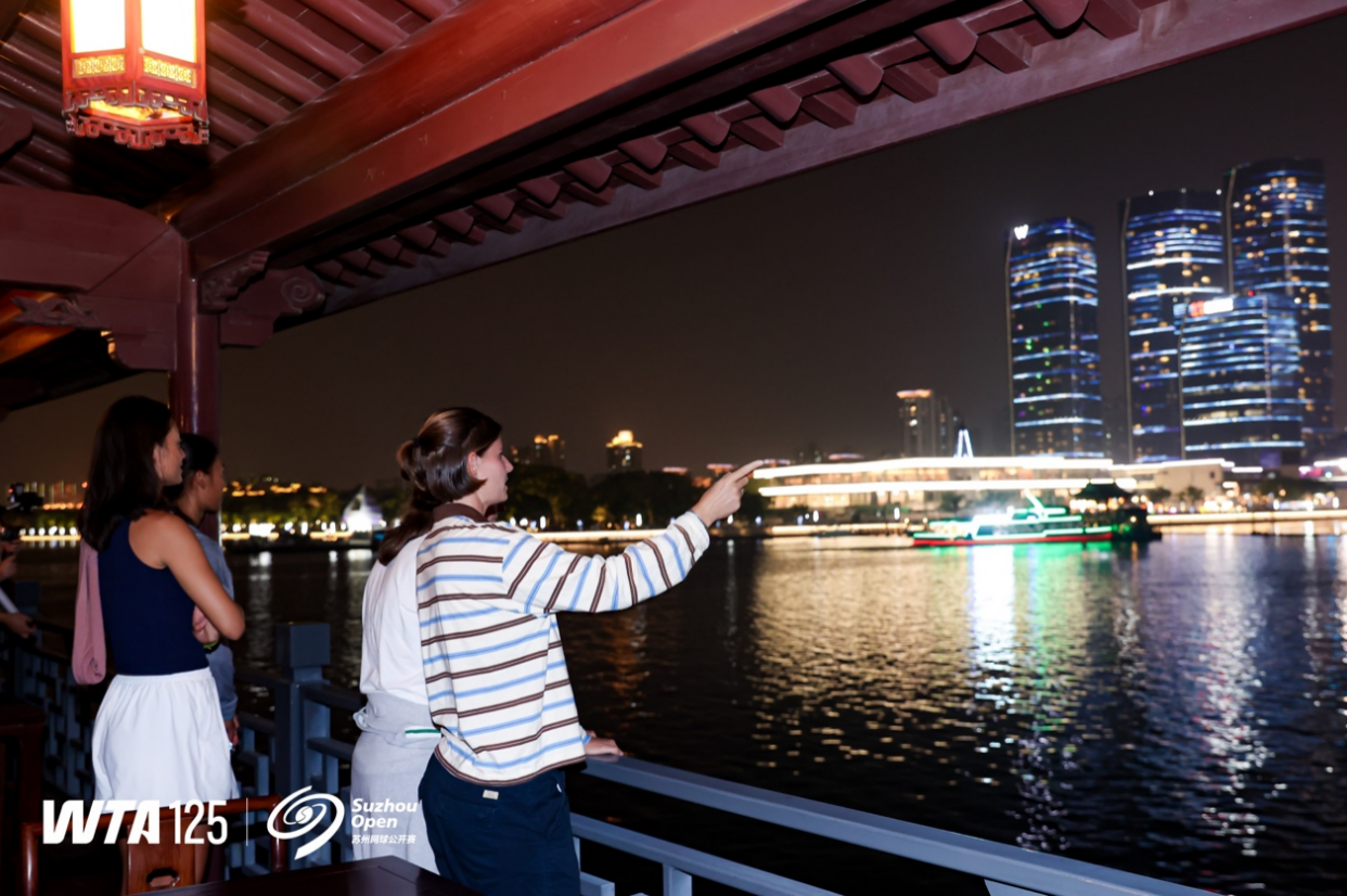 9月27日,WTA125苏州网球公开资格赛开赛。当天比赛结束后,一场别开生面的“夜游金鸡湖·昆曲赏鉴”文化体验活动开启,来自全球的参赛球员来到金鸡湖的月光码头,登上游船,体验昆曲艺术,欣赏音乐喷泉。