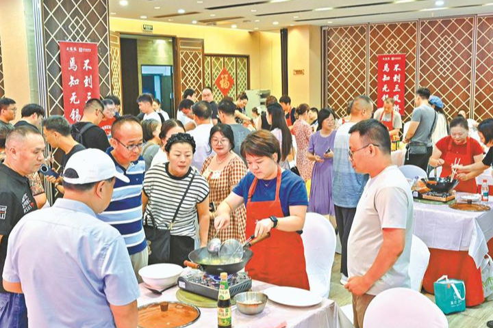 9月27日下午,全民锡菜烹饪技能大赛决赛在三凤酒家热烈“开火”。15名烹饪高手现场会师,上演了一场舌尖对决。选手需在40分钟内完成一道拿手菜,糖醋排骨、油爆虾、四喜面筋等特色锡菜成为热门赛品,现场锅铲翻飞,香气四溢,吸引众多烹饪爱好者和市民前来观赛。(李一芳 摄)