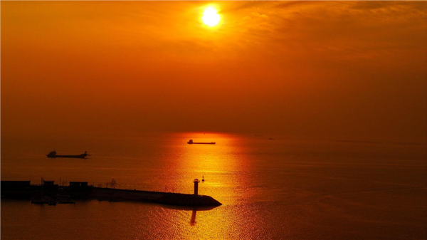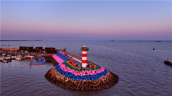 日落时分,港区西连岛堤头灯塔与彩绘防波堤交相辉映,海面被余晖染成金色,归港渔船缓缓摇曳。游客在灯塔、彩绘堤坝和主题墙绘前驻足拍照,这里逐步成为游客热衷的“蓝色打卡地”。