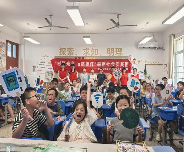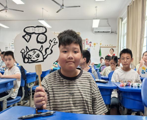 实践团先后走进建军路小学、新区实验小学暑托班,打造“材智课堂,数字未来”主题系列活动。志愿者发挥材料专业优势,带领孩子们动手完成“纳米胶带创意电路”实验——用纳米胶带搭建简易电路,点亮LED灯,让抽象的材料科学知识变得直观有趣;同时组织“网络安全主题团扇绘制”活动,引导孩子将“不透露家庭住址”“不点击陌生链接”等安全常识画进扇面,强化记忆;此外开设数字素养讲座,通过情景模拟、互动问答,讲解“防网络诈骗”“防手机沉迷”“保护个人隐私”等内容,既点燃青少年科技探索热情,又筑牢其数字安全“防火墙”,校方评价“活动将专业知识与成长需求完美结合,是一堂生动的‘科技+安全’实践课”。