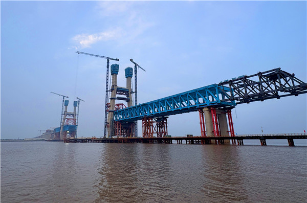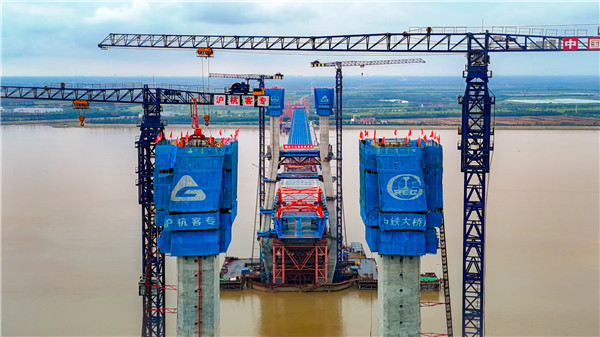 崇启公铁长江大桥是我国“八纵八横”骨干铁路――沪渝蓉高铁的控制性工程,全长4.09公里,横跨长江入海口北支航道。其设计构造为双层公铁两用无砟轨道斜拉桥桥,上层为时速100公里的双向6车道一级公路,下层是时速350公里的双线高速铁路+时速250公里的双线城际铁路。主通航孔跨径400米,是目前在建的世界最大跨度公铁两用无砟轨道斜拉桥,也是我国迄今为止长江上时速最快的公铁两用过江大通道。大桥建成后对优化沿长江地区铁路网布局、服务长江经济带协同发展,推动长三角高质量一体化发展等具有重要意义。(崔永兴 王世琪 李梦竹 杨涛)