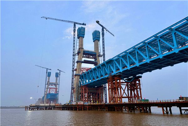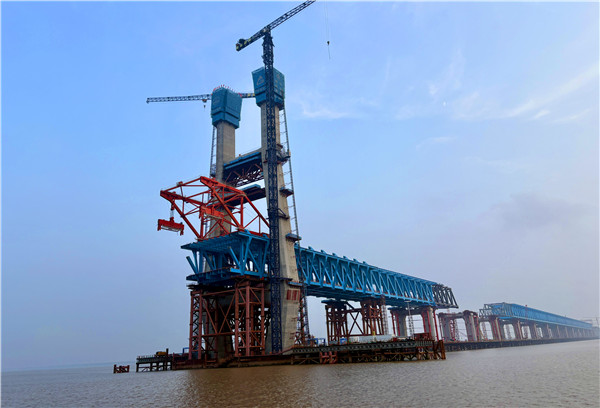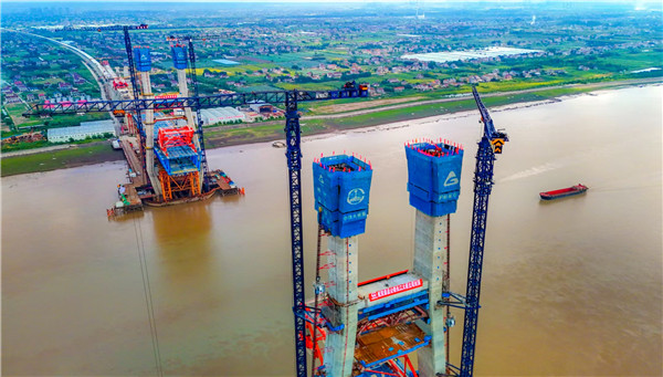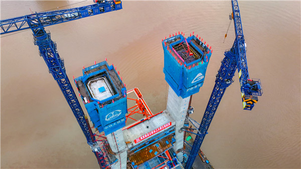 9月29日,在长江入海口北支航道,随着最后一方混凝土从大桥3号墩和4号墩施工平台同时泵送至153米高的塔顶,这座由长江沿岸铁路集团公司建设,沪杭客专公司建设管理,中铁大桥局施工的世界最大跨度公铁两用无砟轨道斜拉桥沪渝蓉高铁崇启公铁长江大桥双主塔同日封顶,至此,主通航孔南北两座主塔主体施工全部完成。